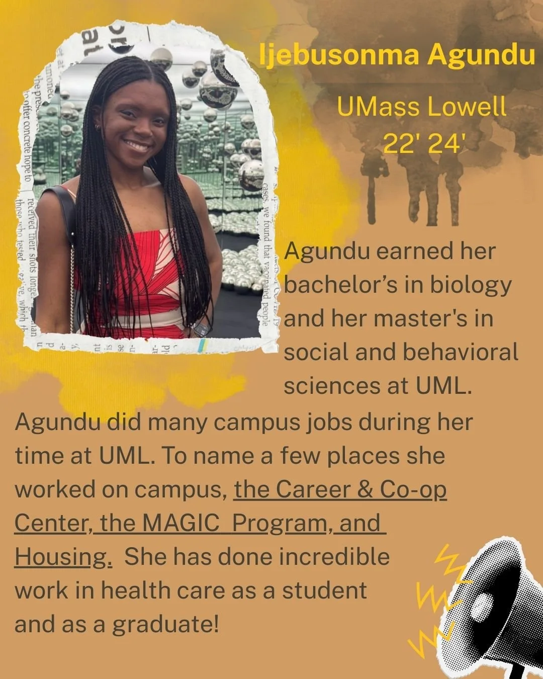 Eftihia had the privilege of getting to highlight black alumni students who worked on campus jobs, research positions, and internships while at UMass Lowell. She sourced alumni and designed the carousel post.